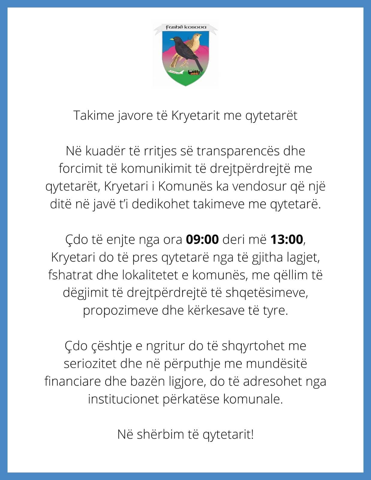 Çdo të enjte nga ora 09:00 deri më 13:00, Kryetari do të pres qytetarë nga të gjitha lagjet, fshatrat dhe lokalitetet e komunës, me qëllim të dëgjimit të drejtpërdrejtë të shqetësimeve, propozimeve dhe kërkesave të tyre.